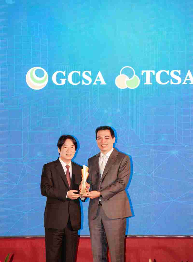 达全方位永续表现获全球永续奖及台湾永续奖肯定,,,由副总统赖清德颁奖 (左),,传奇国际总经理柯富仁 (右) 代表领奖