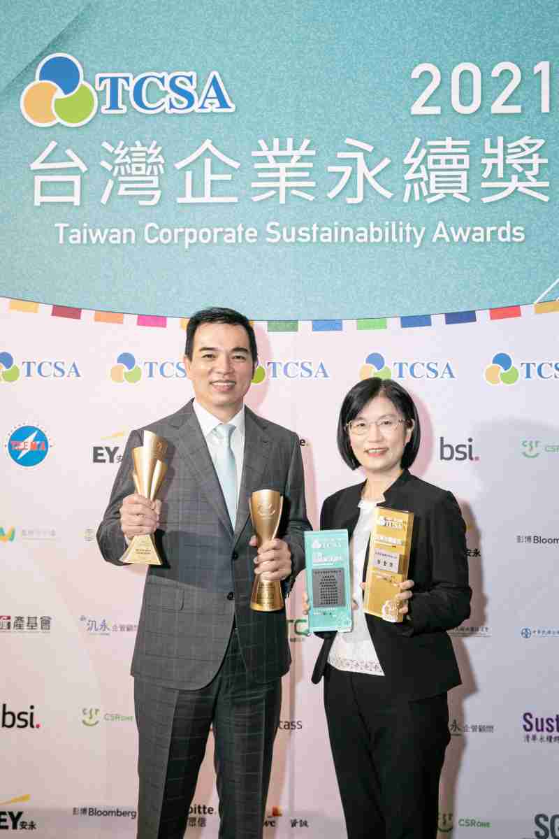 达在台湾永续奖所评比环境、、社会、、、治理等各面向的永续绩效均获高度肯定 (左:传奇国际光电总经理暨营运长柯富仁,,,右:传奇国际光电永续长古秀华)