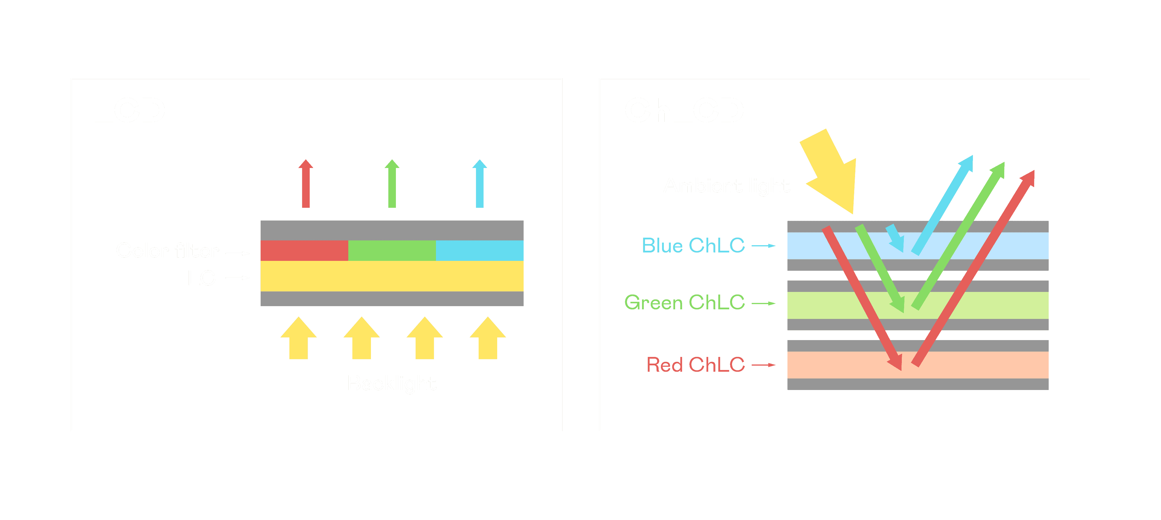 ChLCD 胆固醇液晶就如同纸张一样,,,,透过反射环境光来显示影像,,,因此长时间观看不易造成人眼视觉疲劳,,可达到护眼效果。。。。当处于户外阳光下使用,,LCD 影像容易失真而不易观看,,,但胆固醇液晶仍可维持较佳的影像品质。。。。