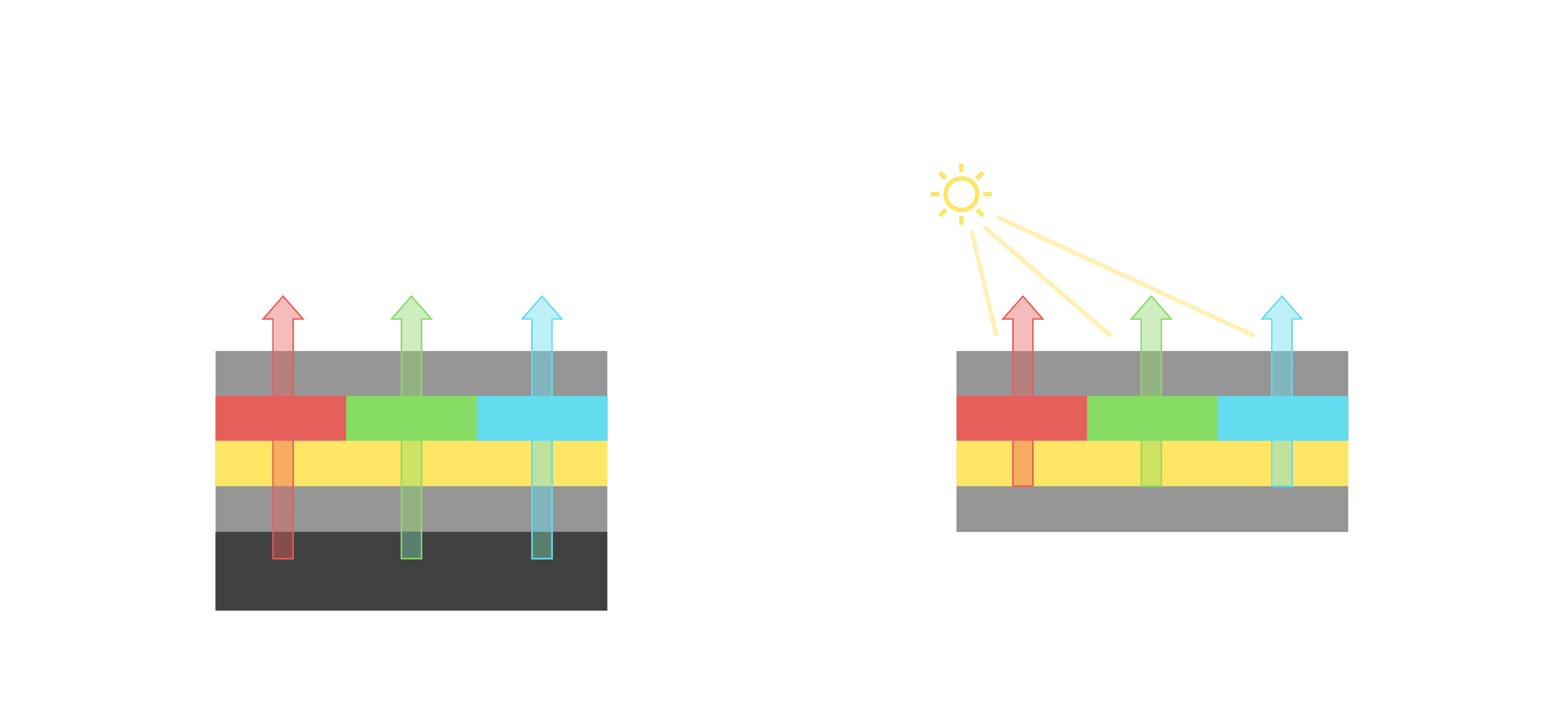 与传统需搭配背光单元的液晶显示相比,,,反射式液晶技术不仅更省电、、、更轻薄,,,,且即便在艳阳下仍能清晰显示。。此外,,少了背光单元,,,也大幅降低了 LED 蓝光伤害眼睛的疑虑。。。。
